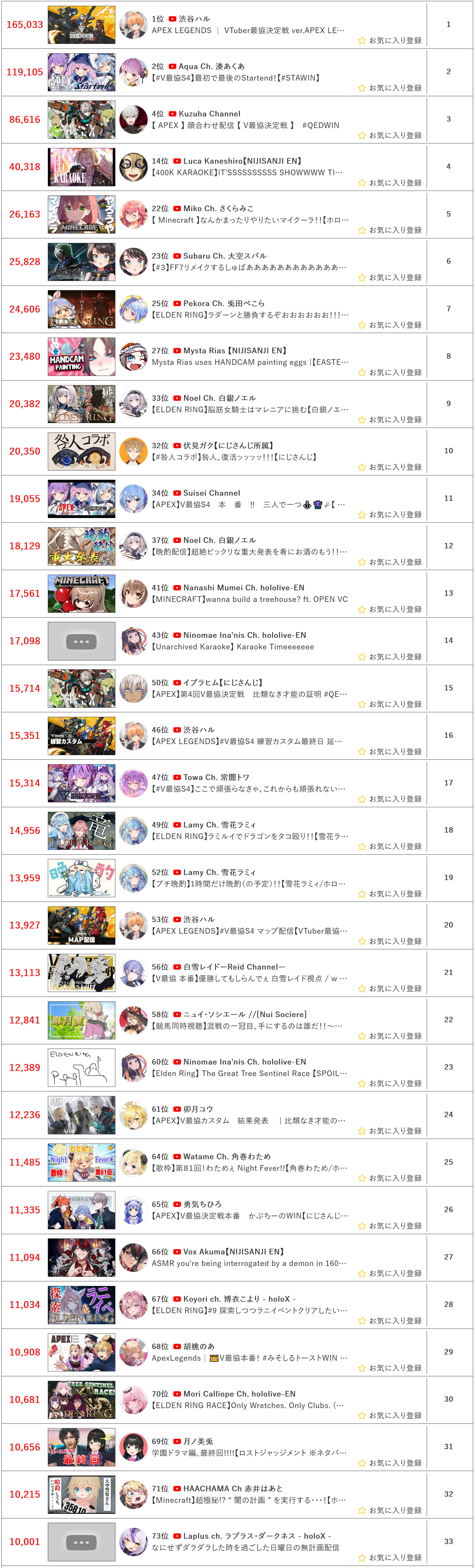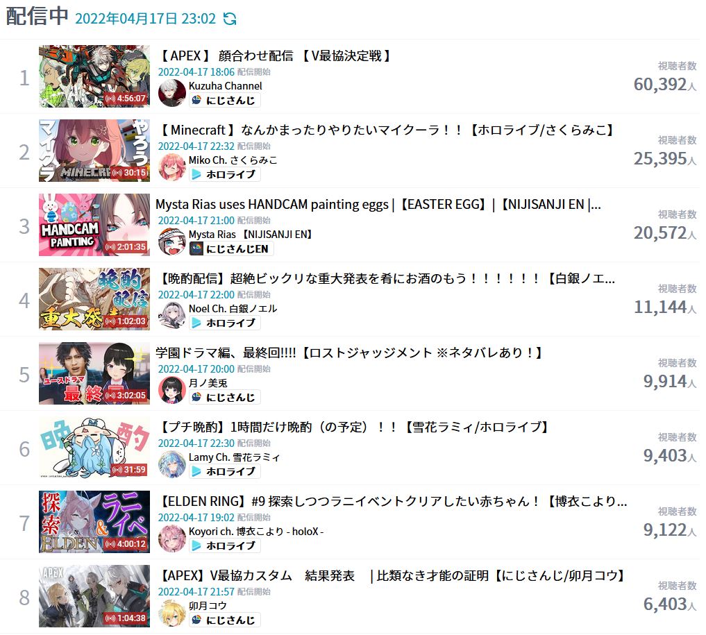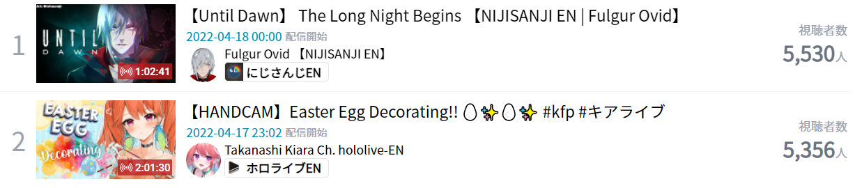 14. Vox (Nijisanji) - 59,507 (Unarchived Karaoke + 522k subscriber celebration)