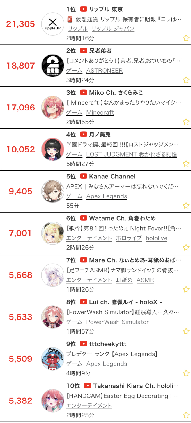 13. Mori (Hololive) - 18,784 (Tea Party zatsudan w/Gura and Kronii)