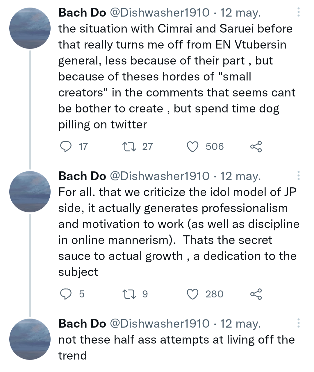 >i always thought vtuber fans were so cringyMost VTubers don't even see themselves as idols or do GFE and most fans aren't like that. Plus, the phenomenon is way older than VTubers and applies to regular celebrities as well. But she just wrote "vtuber fans". If she thinks all VTuber fans are cringy, why the hell did she become a VTuber?