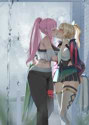 The years of distant admiration perverted into a primal longing to breed, I push both hands against the back of her head and push my tongue inside her lips as I twist my own hips, smearing the liquid dripping from my cock all over her waist and belly button.
