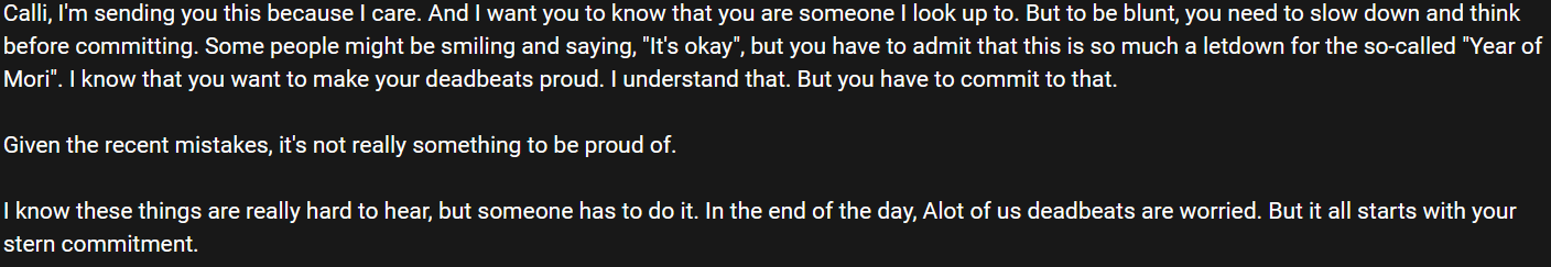 Calliope regarded Deadbeat's cringe hair and short pubes. "I feel the same way!" revealed Calliope with a delighted grin.