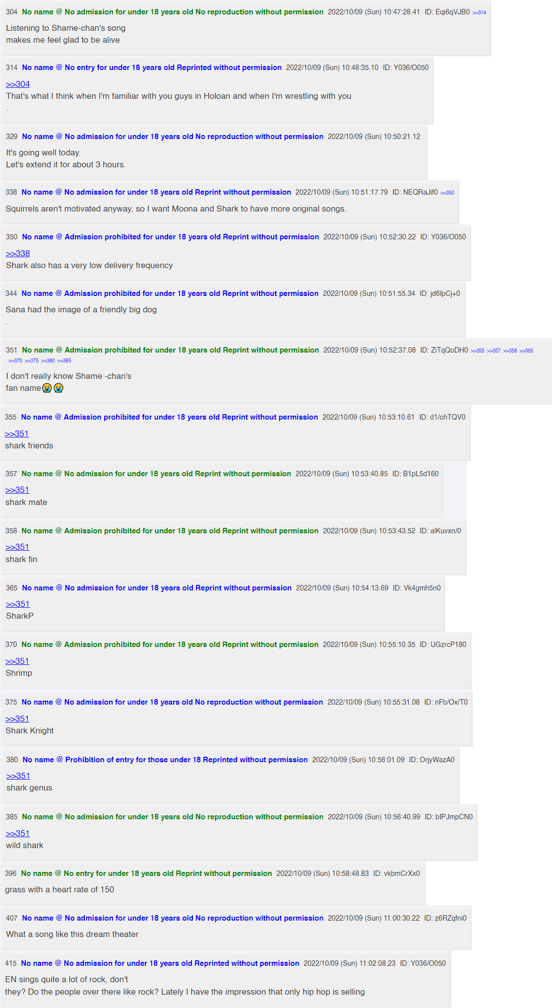 2x: Ange, Botan, Fubuki, Ibrahim, Korone, Koyori, Lui, Maimoto, Mel, Mito, Mori, Mysta, Shion, Sora, Tsukasa, Vox