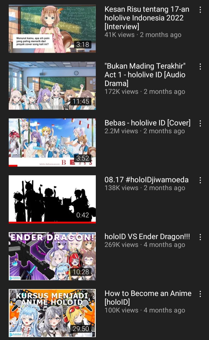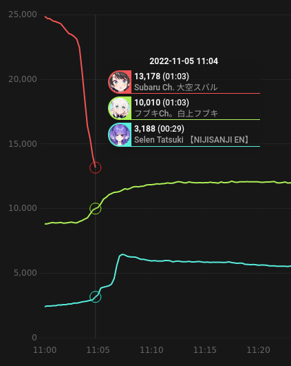 1x: AI, Aki, Axia, AZKi, Chima, Chronoir, Debi, Furen, Gwelu, Haachama, Hayase, Hoshikawa, Iroha, Kaida, Lain, Laplus, Leos, Luna, Masaru, Melissa, Mikeneko, Moona, Nagao, Naruse, Natsume, Ren, Roboco, Rushia, Sana, Sango, Selen, Shiina, Sukoya, Ui, Watame, Yashiro, Yorumi, Zeta