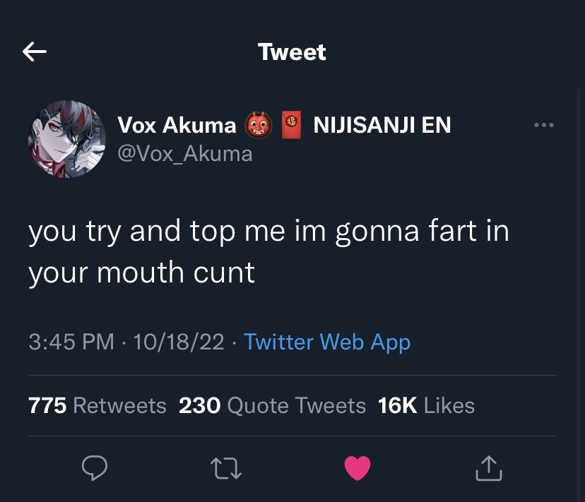 >>36663739Most of the people here (as in 4chan, not just /vt/) are too shy/anxious to shitpost where they could be recognized, so deep down they respect those who do it. Even though in this case it's probably not good since Vox isn't the most stable fella.