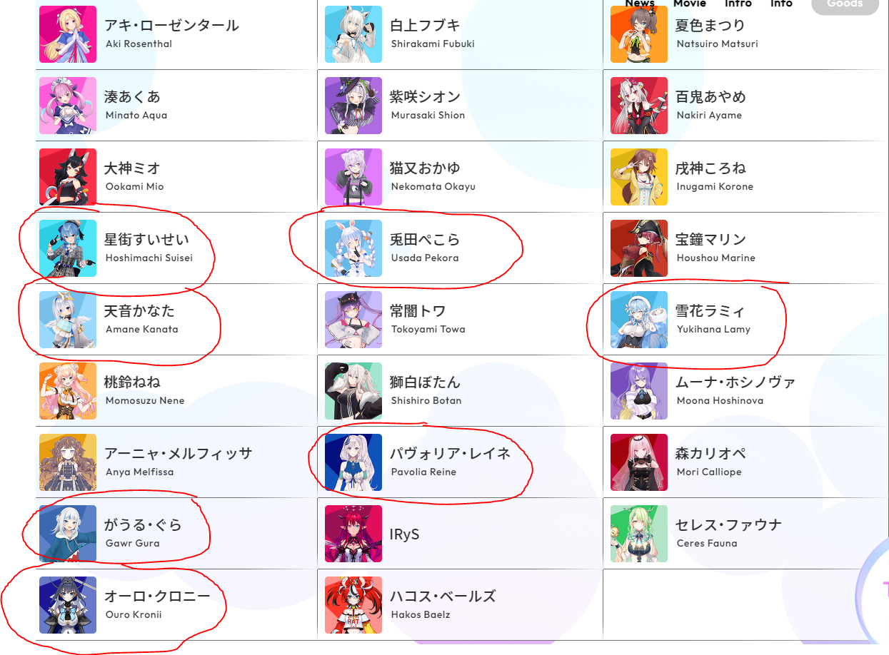1x: Aia, Aki, AZKi, Dola, Enna, Gatchman, Haachama, Ibrahim, Ike, Kaida, Kanae, Kazaki, Kyoko, Laplus, Leos, Luna, Magni, Maimoto, Mayuzumi, Mel, Met, Minase, Noel, Nose, Patra, Petra, Polka, Ponpoko, Ponto, Rikiichi, Rosemi, Ryushen, Sora, Sumire, Tsukasa, Ui, Voltaction