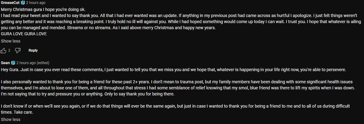 it was unavoidable that there would be a viewer blowup about communication, because she had steadily extinguished even the last leftover traces of communication, with no sign of a reversal in the trend. all the while, she presented circumstances that heightened the value of communication: streams were rarer than ever, and viewers faced a sequence of streams and breaks characterized by total and pure entropy. there might be streams on consecutive days, or a stream might suddenly, without warning, be followed by more than a week without one.