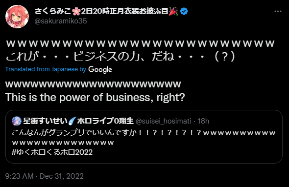 Lastly, Miko and Suisei keep getting closer and closer and there's surely more to come for them in 2023. In 2022 we got LINE interactions, Miko confiding in Suisei, Suisei visiting Miko's house in Christmas, Miko meeting Suisei's entire family and so on. As some anons have said before, micomet is all about a slow burn yuri manga. And remember some of (You) have said many times "there's no way something can be better than this, this is peak micomet" just to be proven wrong every time. Let's pray to the micometgod as Suityan said, and he'll smile at us.