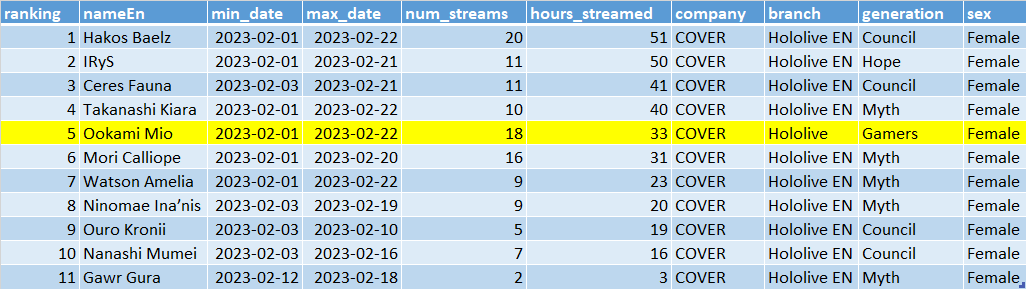 1x: Choco, Gaku, Himawari, Hololive, Ina, Koyori, Lamy, Miko, Mio, Mito, Nerumero, Nozomi, Polka, Roco, Suisei, Watame, Yashiro