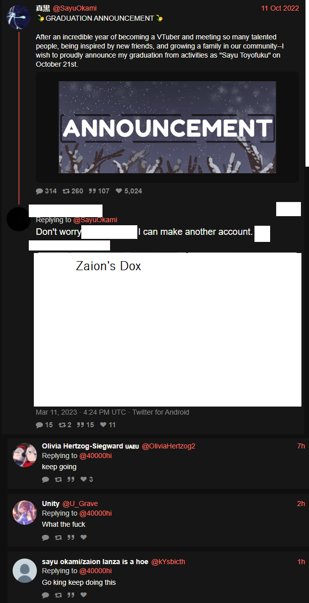 You can go on twitter RIGHT NOW and find her full name, address, former employers, and all of her family in the main thread of both Sayu's graduation and the Nijisanji announcement and no one is doing shit, people are actively encouraging it. Some of these are liked by other vtweeters who are followed by the other talents.