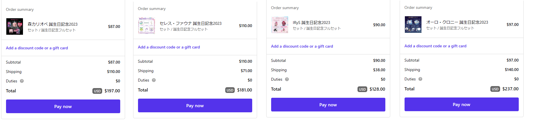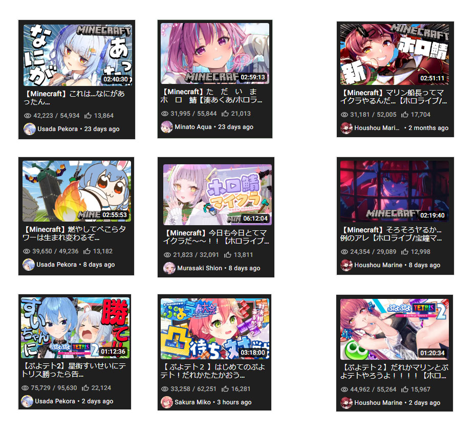 1x: Aqua, Ayame, Choco, Gaku, Gura, Himawari, Hinano, Ina, Kiara, Mito, Mori, Nozomi, Polka, Roco, Shion, Watame, Yashiro