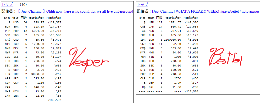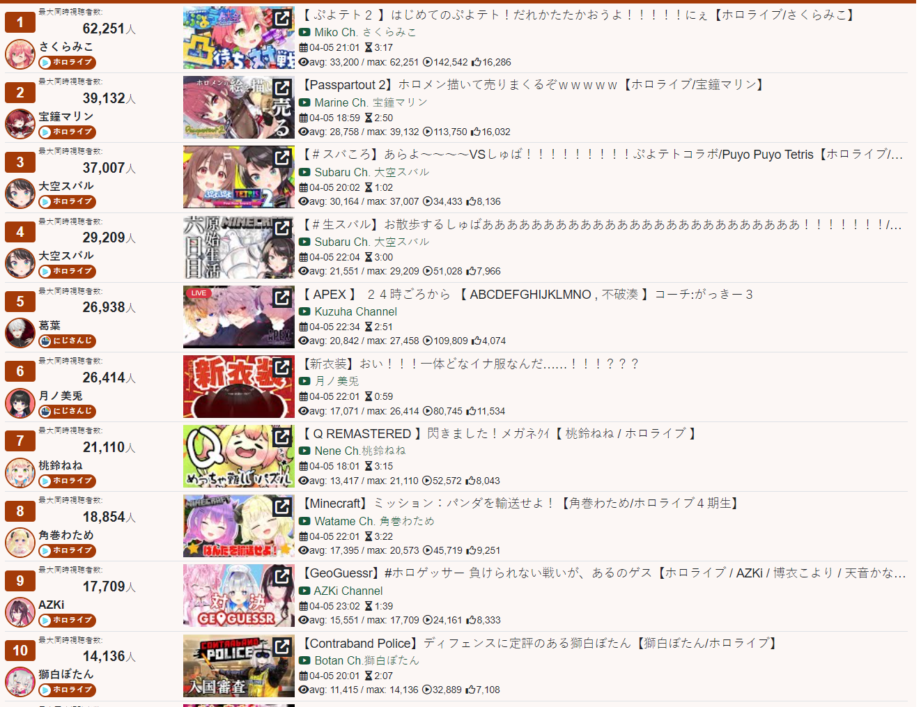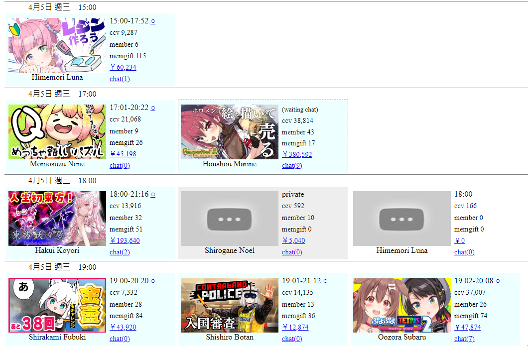 >PER STREAMER1x: Chiroru, Hal, Miko, Pekora, Toya