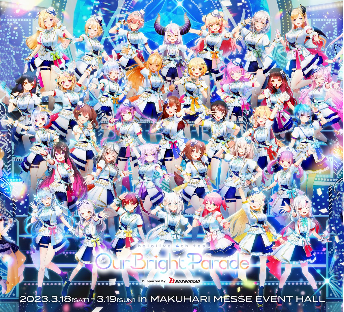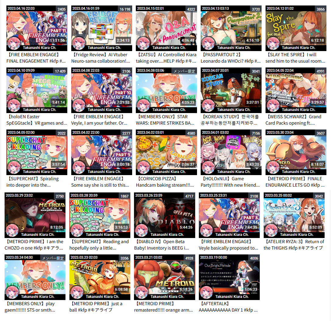1x: Aqua, Ayame, Choco, Gaku, Gura, Himawari, Hinano, Ina, Iroha, Kiara, Korone, Mito, Mori, Nozomi, Polka, Ponto, Roco, Ryushen, Salome, Shion, Watame, Yashiro