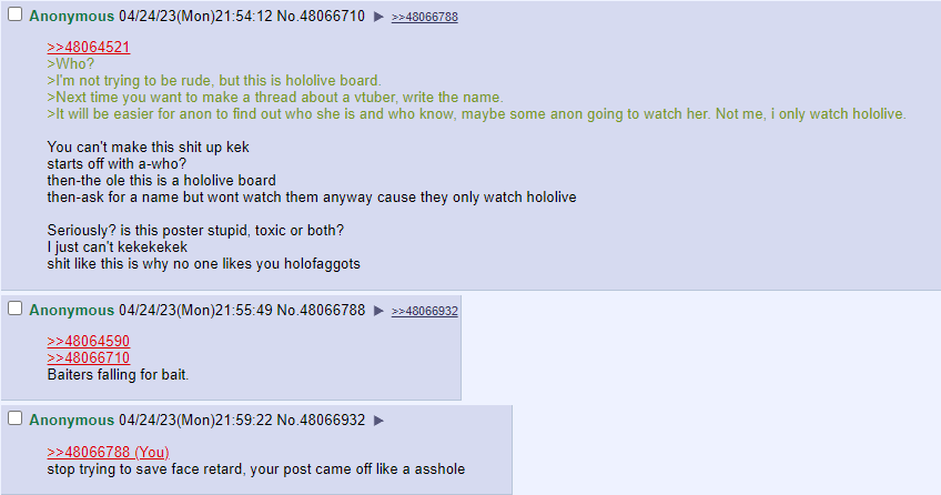>>48064521>Who?>I'm not trying to be rude, but this is hololive board.>Next time you want to make a thread about a vtuber, write the name.>It will be easier for anon to find out who she is and who know, maybe some anon going to watch her. Not me, i only watch hololive.You can't make this shit up kek