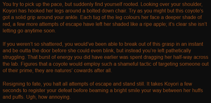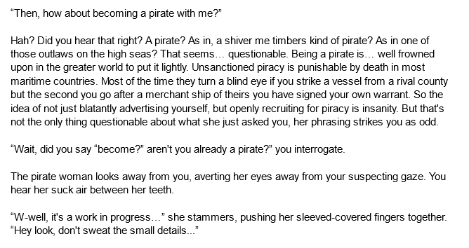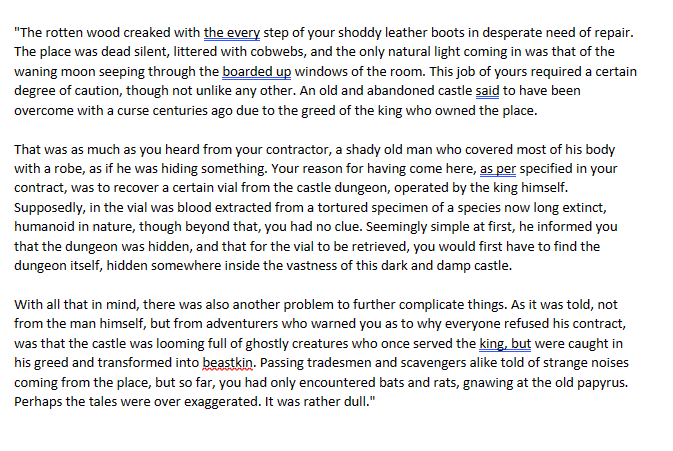 With all that in mind, there was also another problem to further complicate things. As it was told, not from the man himself, but from adventurers who warned you as to why everyone refused his contract, was that the castle was looming full of ghostly creatures who once served the king, but were caught in his greed and transformed into beastkin. Passing tradesmen and scavengers alike told of strange noises coming from the place, but so far, you had only encountered bats and rats, gnawing at the old papyrus. Perhaps the tales were over exaggerated. It was rather dull."