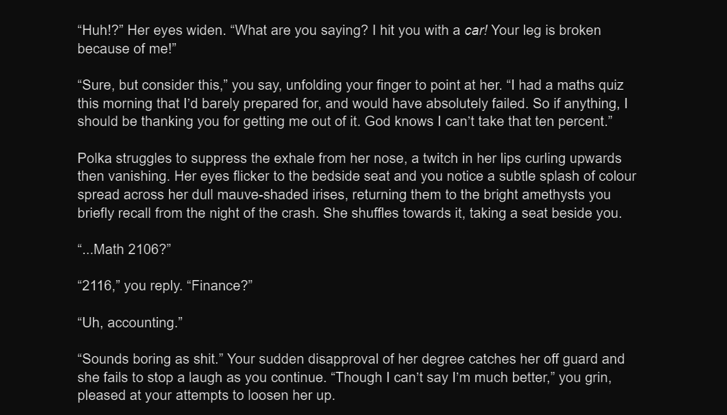 >>48475598"The rotten wood creaked with the every step of your shoddy leather boots in desperate need of repair. The place was dead silent, littered with cobwebs, and the only natural light coming in was that of the waning moon seeping through the boarded up windows of the room. This job of yours required a certain degree of caution, though not unlike any other. An old and abandoned castle said to have been overcome with a curse centuries ago due to the greed of the king who owned the place.