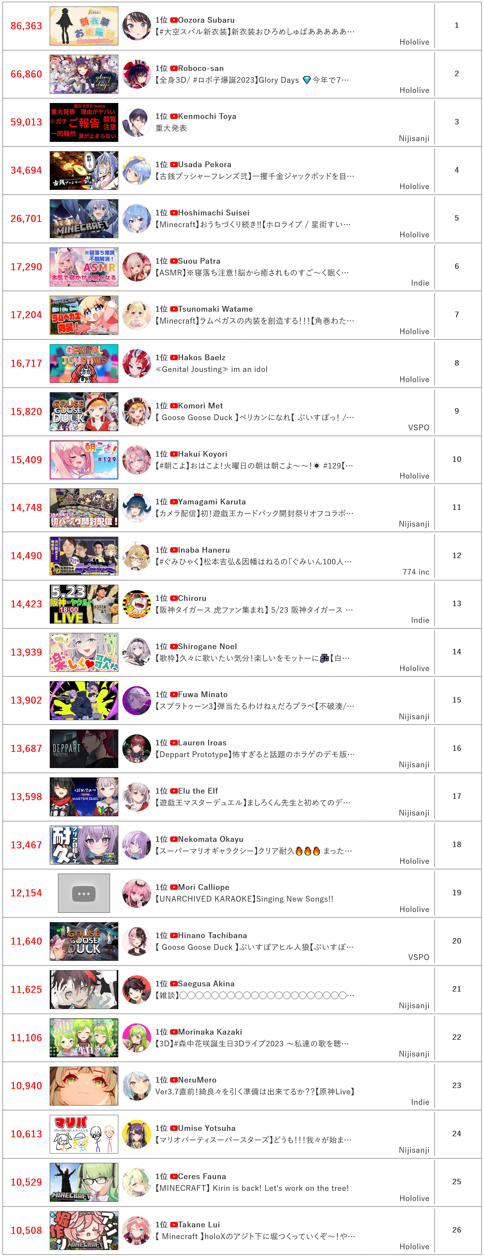 2019-05-19: AzKi and former indie Hoshimachi Suisei moved to Inonaka Music under Cover corp. (+1c)