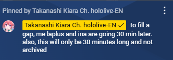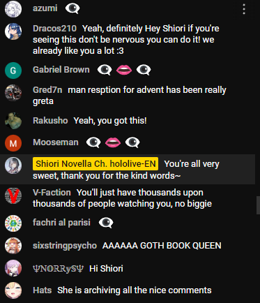 1x: Air, Ayame, Beni, Chloe, Choco, Flare, Gaku, Gura, Gundou, Hibari, Himawari, Ibrahim, Ina, Kaede, Kanata, Kanato, Kiara, Laplus, Lize, Maimoto, Mel, Mito, Mori, Nose, Nozomi, Nui, Polka, Ponto, Qpi, Roco, Ryushen, Shion, Tsukasa, Ui