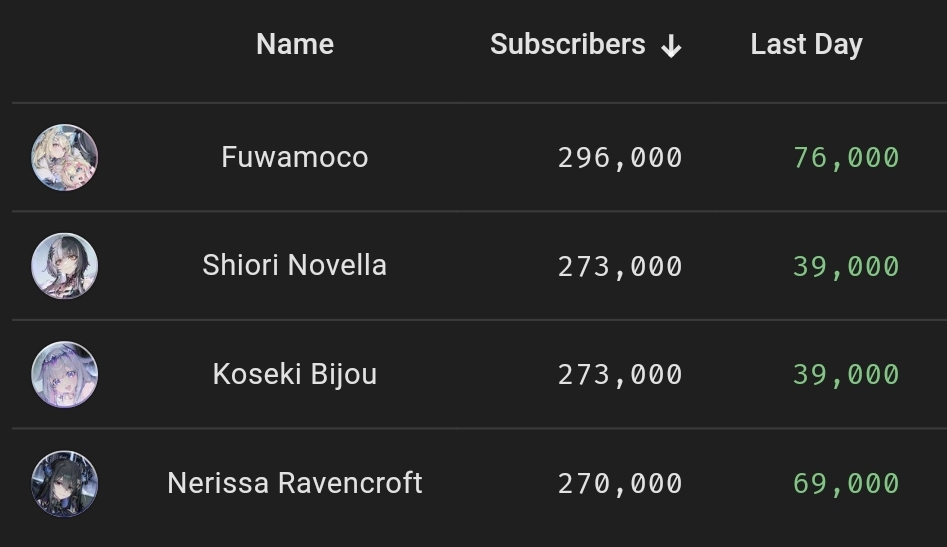 Risu for instance has never been some streaming standout, but go back to her debut days and look at her video numbers. She was legit getting like 200-500k views per NNN video. Mindshare is important in this field and that's what made it so difficult for holoEN to make any ground after 2021.