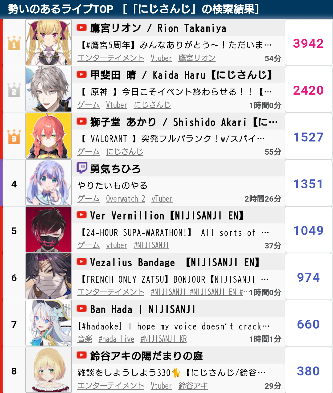 10) Nijisanji (Nijisanji) - 94,194 - Koshien Pre-Tournament Stream