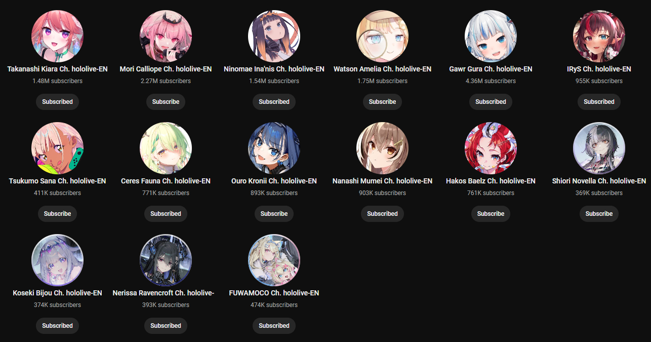 1x: Air, Ayame, Beni, Chloe, Choco, Fuwamoco, Gaku, Gura, Gundou, Hibari, Himawari, Ina, Kaede, Kanata, Kanato, Kiara, Laplus, Lize, Maimoto, Mel, Mito, Mori, Noel, Nose, Nozomi, Nui, Polka, Ponto, Qpi, Rikiichi, Roco, Ryushen, Shion, Tsukasa, Ui