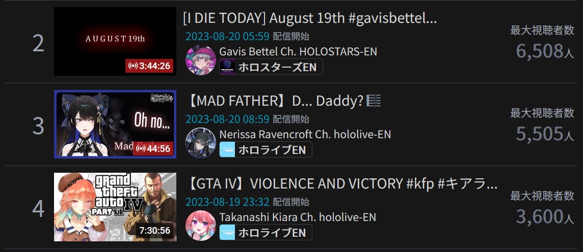 >>56482699>AUGUST 2023 GOLDS1) Miko (Hololive) - 148,555 - Anniversary 3D Live