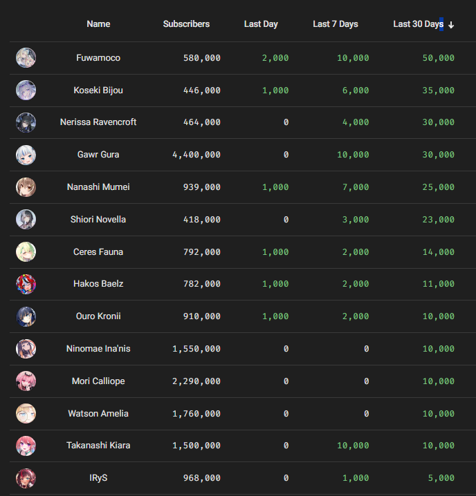 1x: Air, Ayame, Beni, Botan, Chloe, Choco, Fuwamoco, Gaku, Gura, Gundou, Hibari, Himawari, Ina, Kaede, Kanade, Kanata, Kanato, Kiara, Kronii, Laplus, Lauren, Lize, Mel, Mito, Mori, Mumei, Mysta, Noel, Nose, Nozomi, Nui, Polka, Ponto, Qpi, Raden, Rikiichi, Rion, Roco, Ryushen