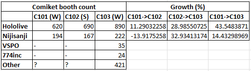 So... the "800+ circles registered" thing is probably true. But that registration also doubles as a right to draw niji IP after their shutdown of DLSite doujins, so people who just wanted to draw and sell art and fan merch with Niji IP would have registered for this, and the actual attendance for the event may have been exaggerated quite a bit