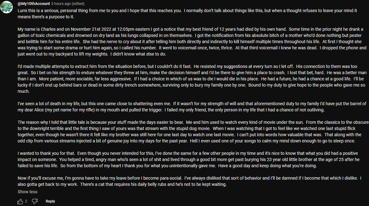 >spontaneous wall of text about their personal problems in the comments/chat of their oshi