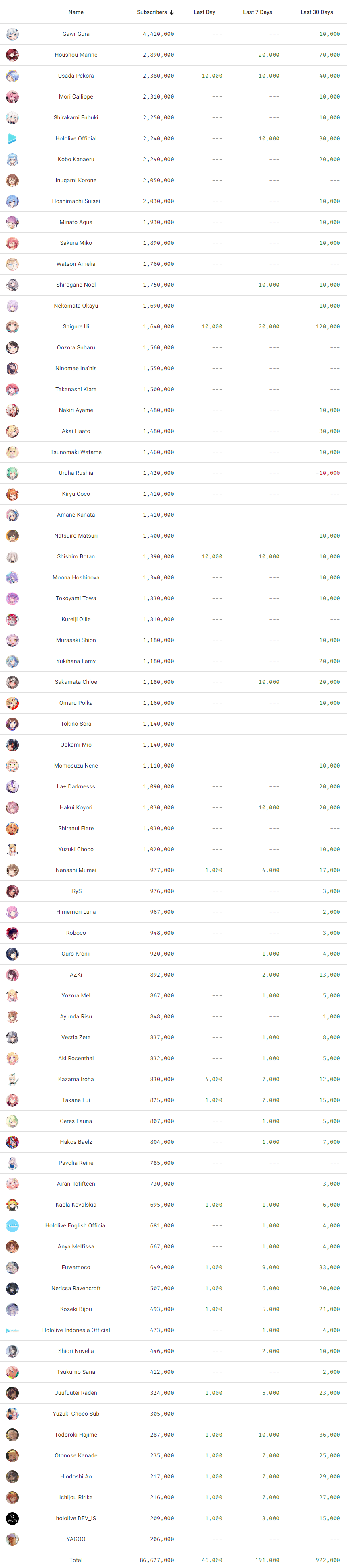 1x: Air, Ayame, Beni, Chloe, Choco, Gaku, Gura, Gundou, Haachama, Hibari, Himawari, Hololive English, Ina, Kaede, Kanade, Kanata, Kanato, Kiara, Kobo, Kronii, Laplus, Lauren, Lize, Luna, Met, Mito, Mori, Mumei, Mysta, Nene, Nose, Nozomi, Nui, Ponto, Qpi, Raden, Rikiichi, Rion, Roco, ROF-MAO, Ryushen, Youko