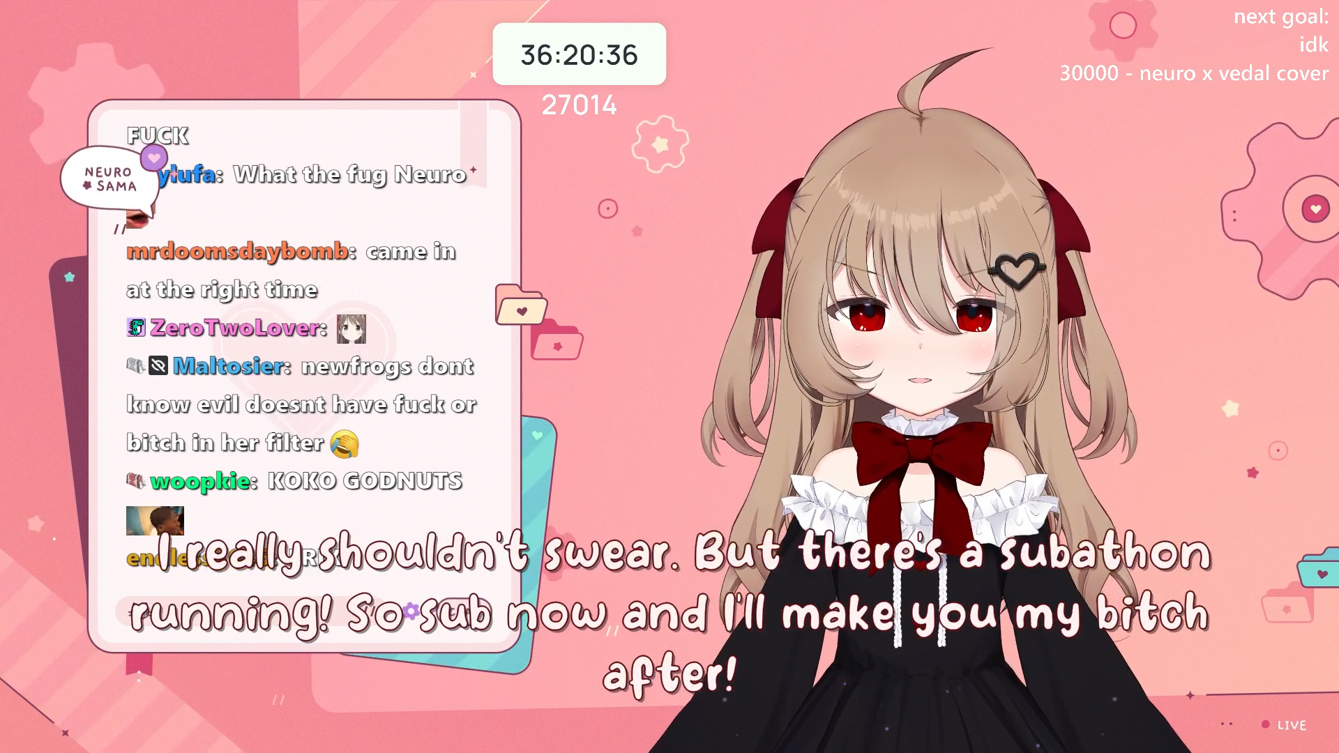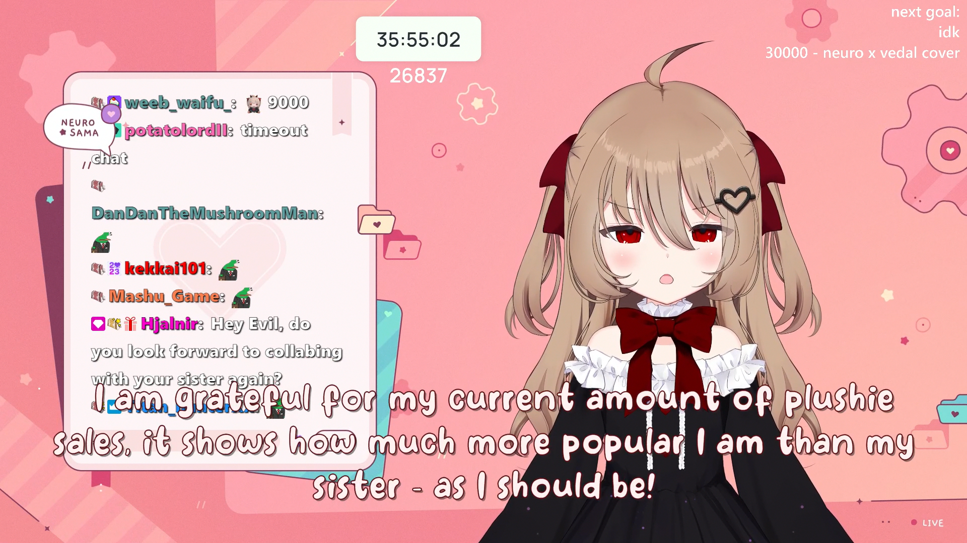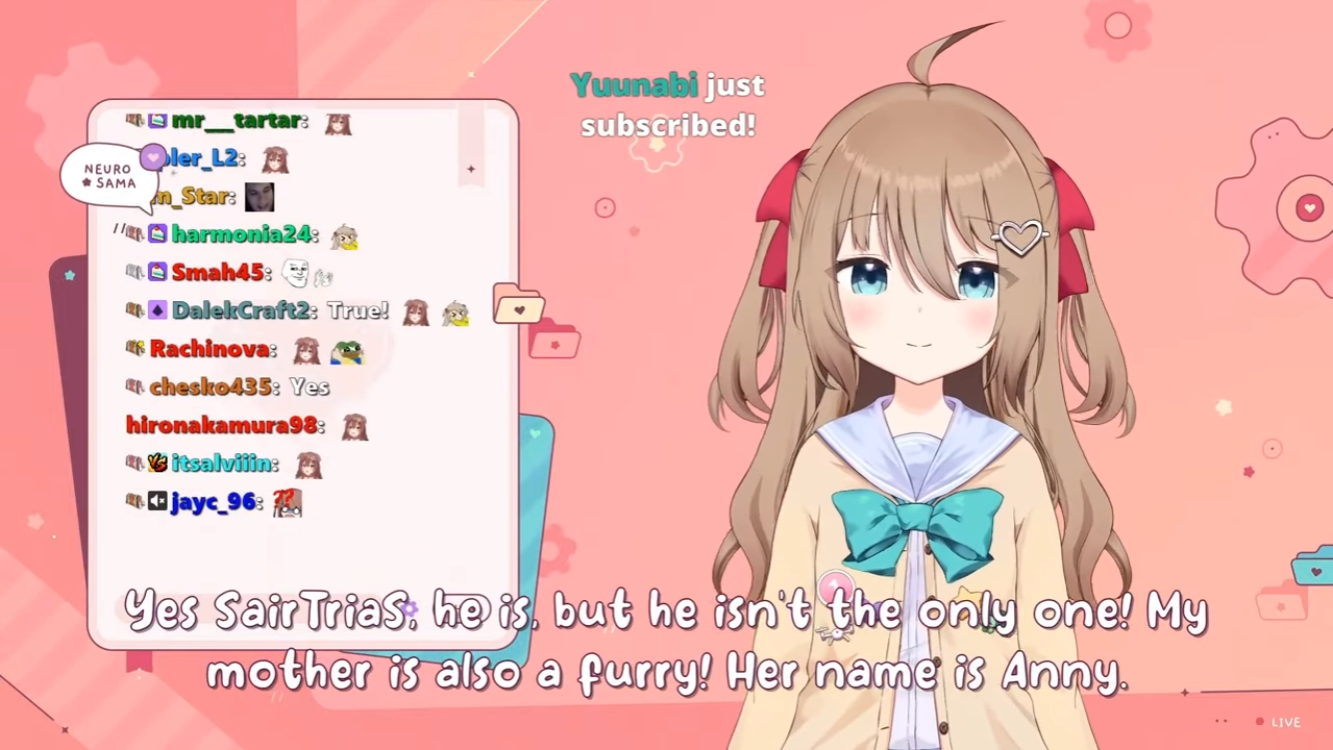 Neuro-sama is a neural network created by Vedal in 2018 for the purpose of learning to play osu! In December 2022 Vedal revived the project with the addition of a large language model, a TTS software and a VTube Studio model, which allow Neuro-sama to interact with her chat as a VTuber. Since then, she has been entertaining the chat with responses and unhinged rants nearly daily, as well as learning new skills such as singing, playing other games, and collaborating with other VTubers. Join /swarm/ today and welcome our new AI overlord!
