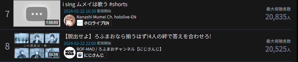 15) Mumei (Hololive) - 43,311 - Valentine's Day One Hour Hangout