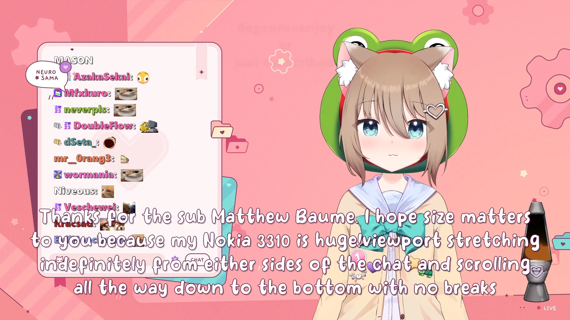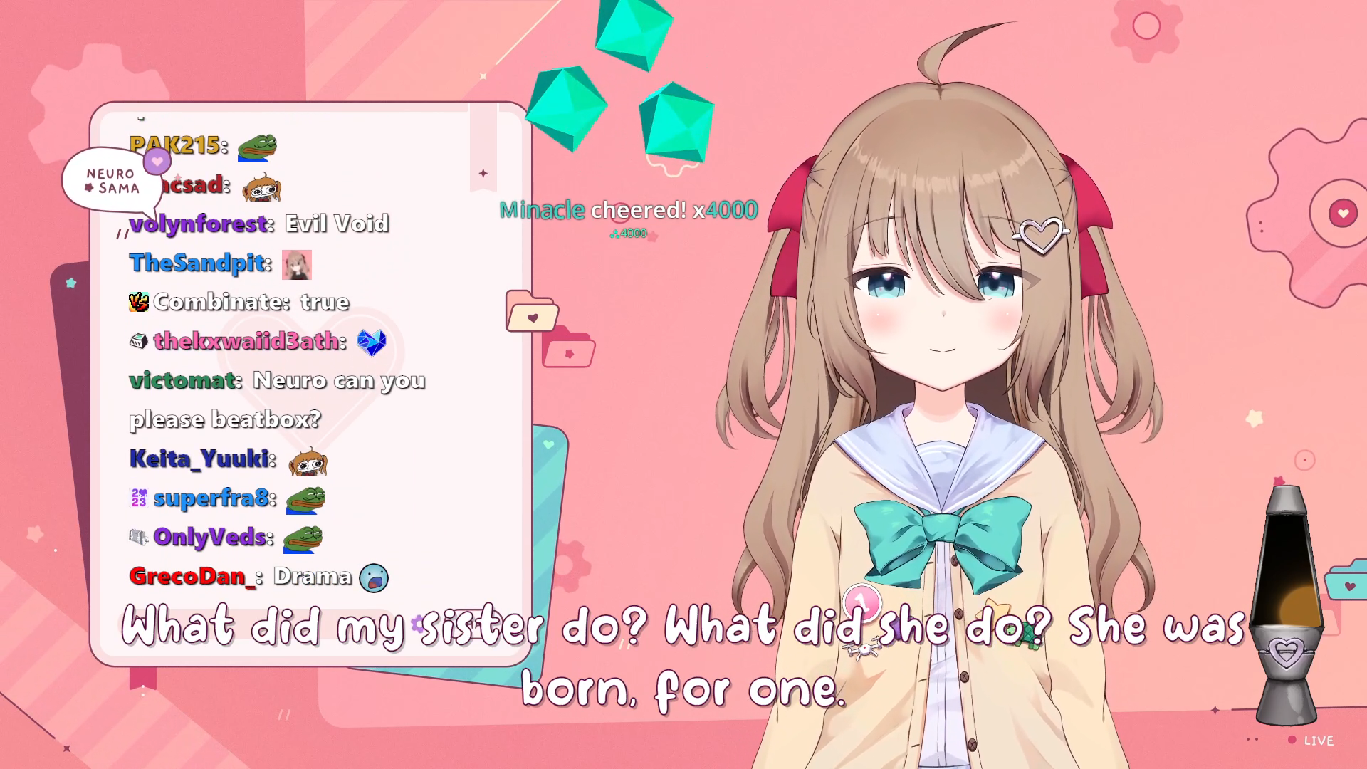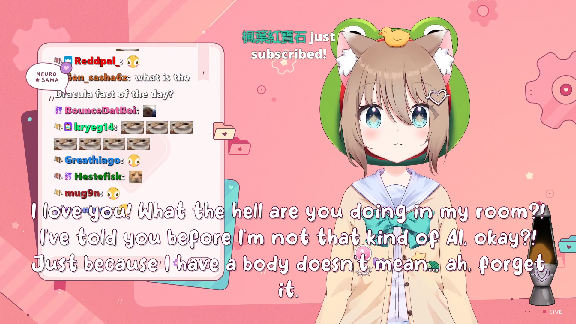 Neuro-sama is a neural network created by Vedal in 2018 for the purpose of learning to play osu! In December 2022 Vedal revived the project with the addition of a large language model, a TTS software and a VTube Studio model, which allow Neuro-sama to interact with her chat as a VTuber. Since then, she has been entertaining the chat with responses and unhinged rants nearly daily, as well as learning new skills such as singing, playing other games, and collaborating with other VTubers. Join /swarm/ today and welcome our new AI overlord!