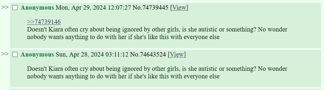 >>74743951This. All of Kiara's bases are covered by better Holos now. You want JP speaker Kiara, you have IRyS and Fuwamoco. You want idol Kiara, you have Bae. You want chatty Kiara, you have Fuwamoco. You want yuri Kiara, pick any member of Promise. You want stream monster Kiara, Biboo is there. She's utterly redundant.