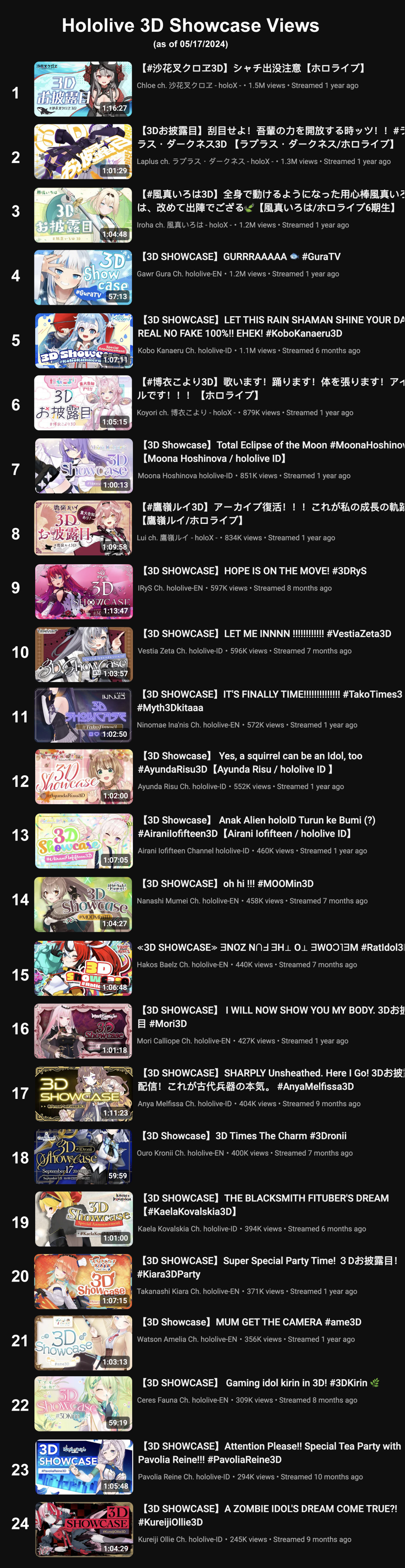 It’s amazing how wide the disparity is between the highest viewed and lowest viewed 3D showcases. Is it because of solely vtuber popularity or is it something about the showcase itself?