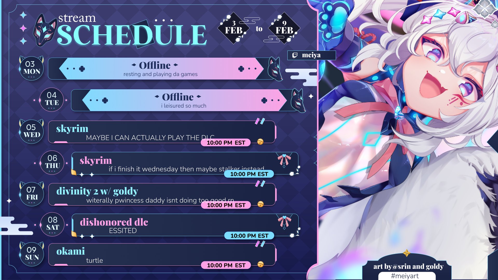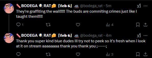 >Her friends (non-inclusive): Coqui, 3AM, Southside, Snuffy >Wrestling >Conspiracy Theories >Cats >Trucking >Omaru Polka >Vidya (God Hand, EDF, Suda51 (NMH and Lollipop Chainsaw especially), Nier, The Bouncer, Resident Evil 7 and 8, Infinity Nikki, Dress To Impress) >Movies (Who Framed Roger Rabbit, Beauty and the Beast, The Land Before Time (Chomper is her favorite), The Holy Mountain) >Shows (Urusei Yatsura, Aqua Teen Hunger Force, Jerry Springer, QVC, Cutlery Corner) >Youtubers (Carpet Bagger, Joe is Hungry, Jacobjones, konbini confessions, MyRetroTV) Also if the card account holder anon is here, what deadline would work for you on the 8th? I currently have it listed at 8pm pst but I'm willing to scale it up or down as needed
