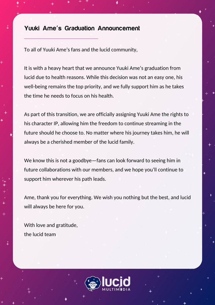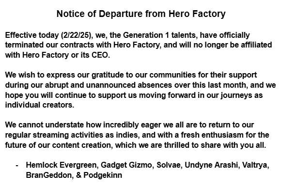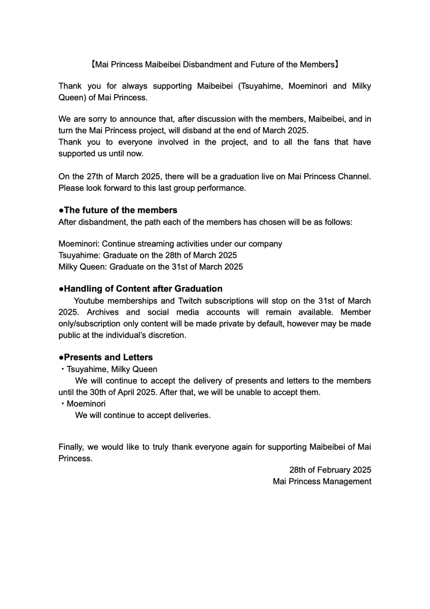 >Hikari Hina announces an indefinite hiatus, citing "unforseen circumstances". Memberships will be suspended until her return. Her last stream was in October 2024.