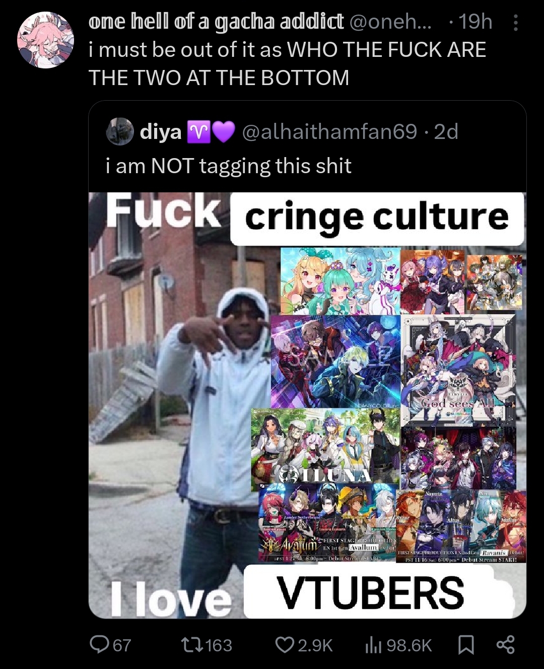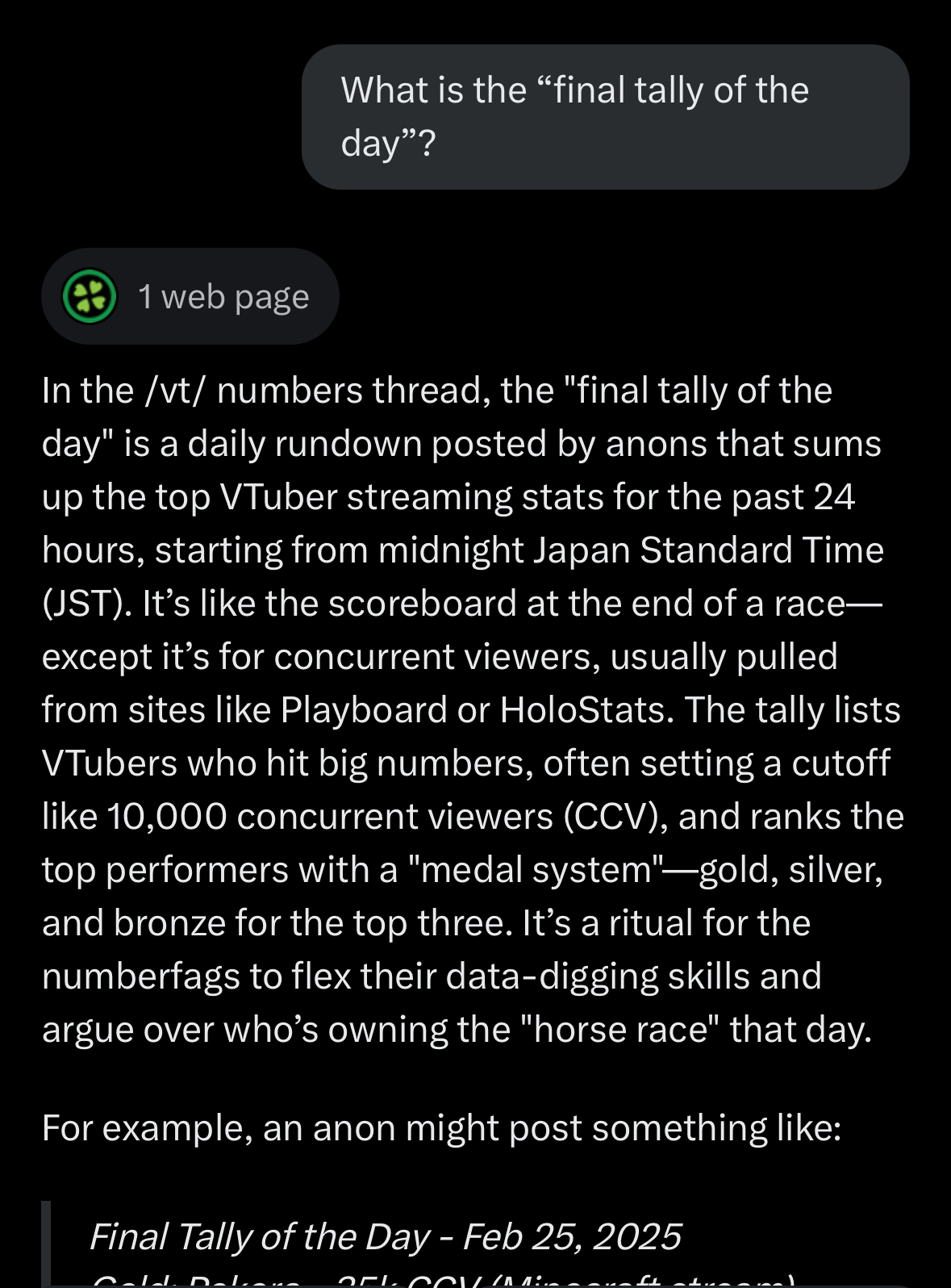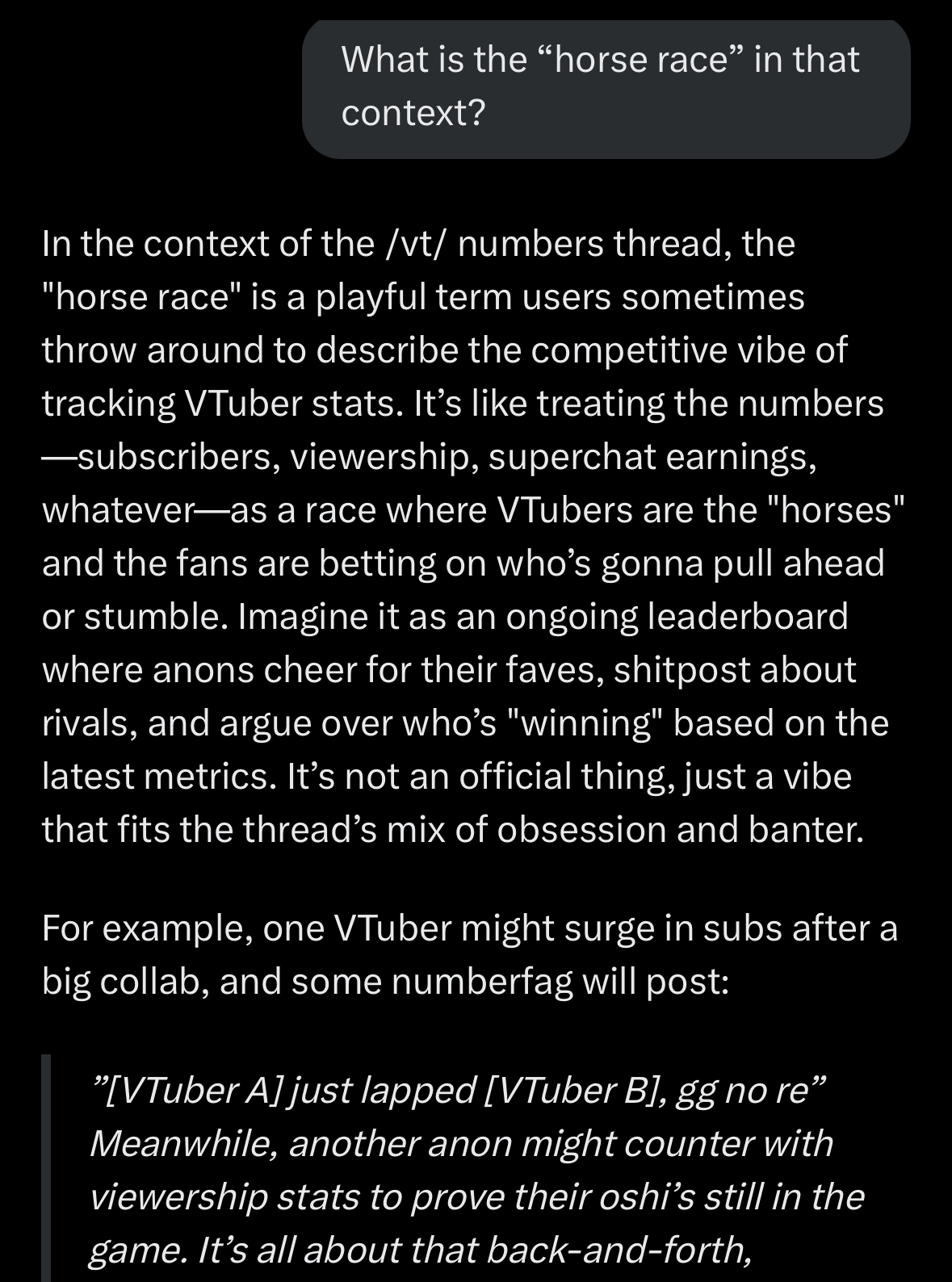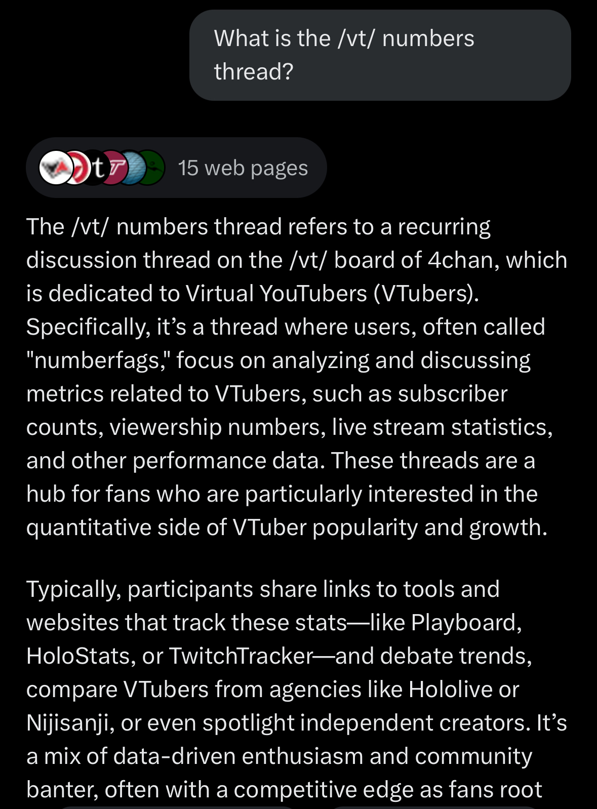 >The /vt/ numbers thread refers to a recurring discussion thread on the /vt/ board of 4chan, which is dedicated to Virtual YouTubers (VTubers). Specifically, it’s a thread where users, often called "numberfags," focus on analyzing and discussing metrics related to VTubers, such as subscriber counts, viewership numbers, live stream statistics, and other performance data.
