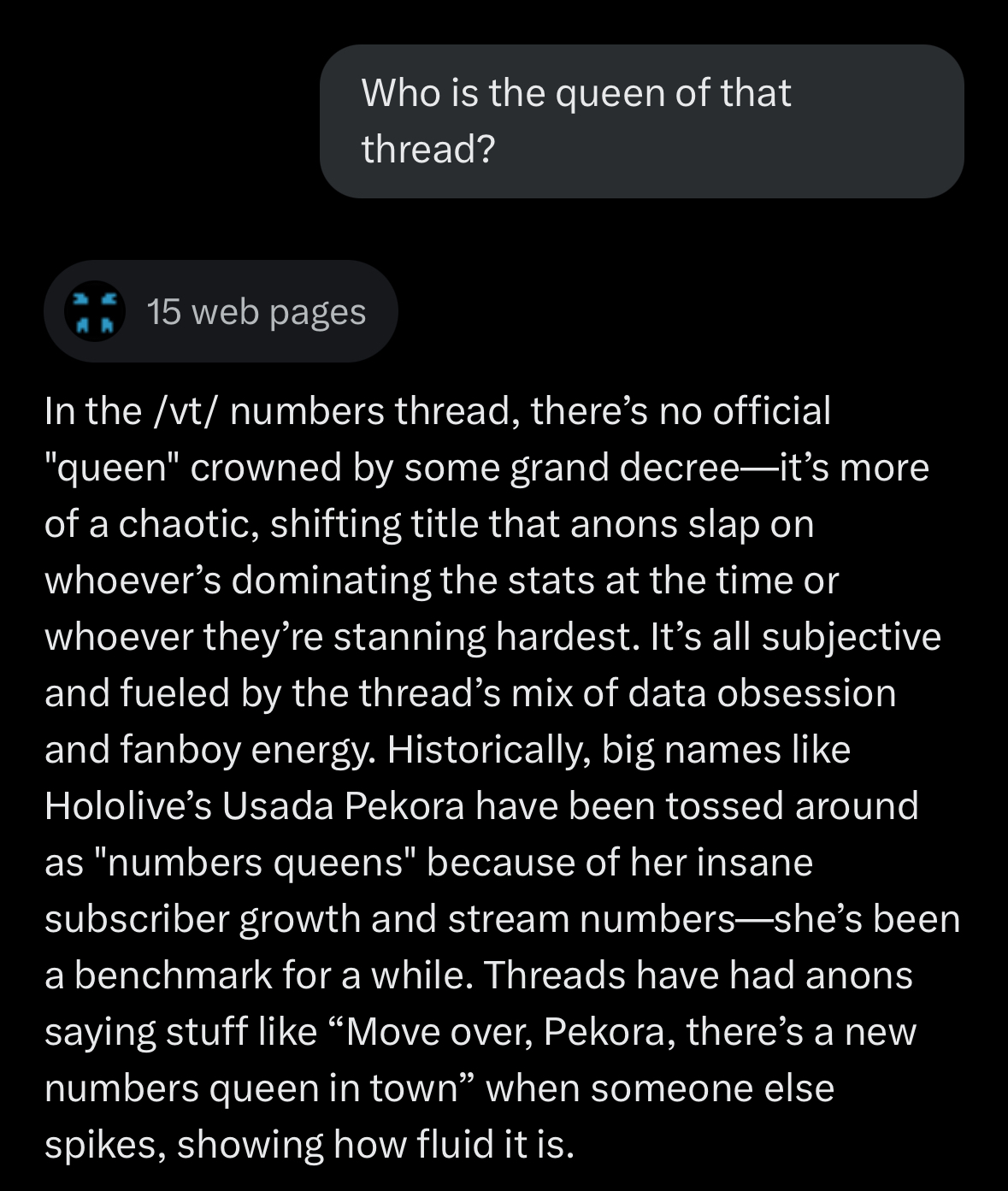 >These threads are a hub for fans who are particularly interested in the quantitative side of VTuber popularity and growth.