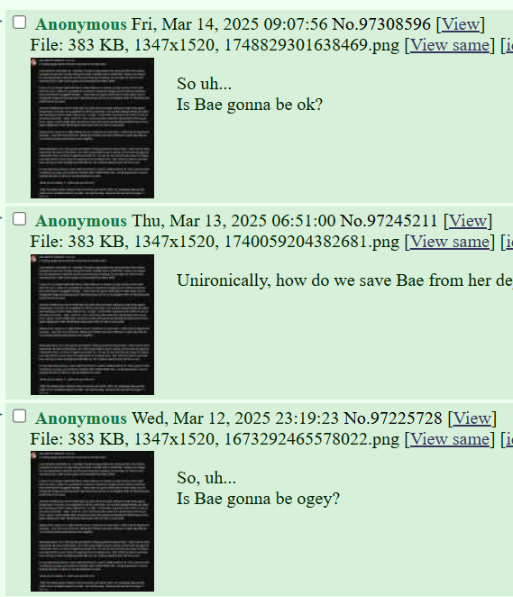 >>97308298>>97308711>>97309210>>97309283There is no "Kiaraschizo" this is just a fabricated gestalt entity that refers to anyone who shitposts about Kiara or KFP. It's not literallyy all just one guy, it's not possible. The speed at which the supposedly samefagged Kiara vs Bae posts happen responding to a single post at a time happen way too fast for it not to be multiple people. People will say 'he uses multiple devices' like as if that would somehow make it easier to manually type out the posts at the same time. Anons will say 'he uses bots' even though this is impossible because of the captcha system.