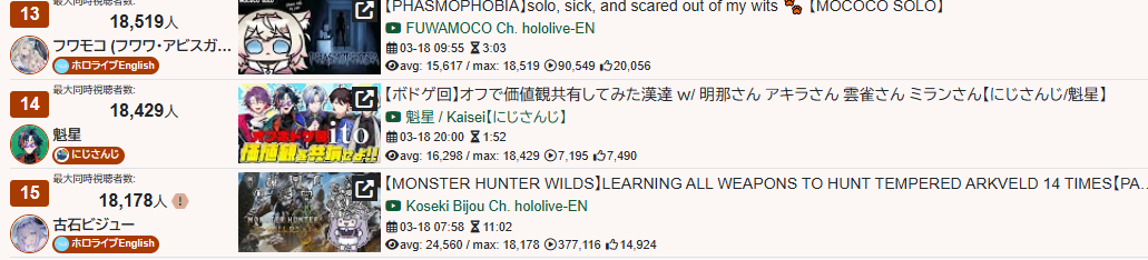 10) Bijou (Hololive) - 19,622 - Monster Hunter Wilds & Post-Fes Talk