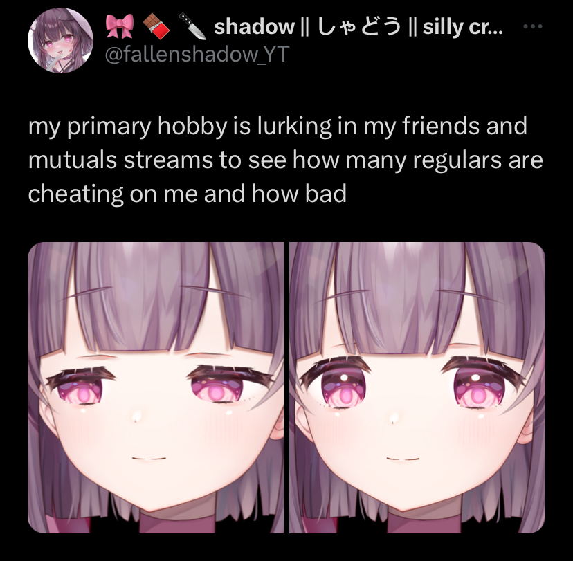 If you aren't aware, Fallenshadow is the most hard-working schizo loli on the internet and enjoys the company of her husbands very much! Please treat her well.