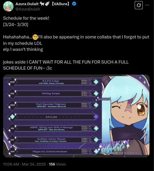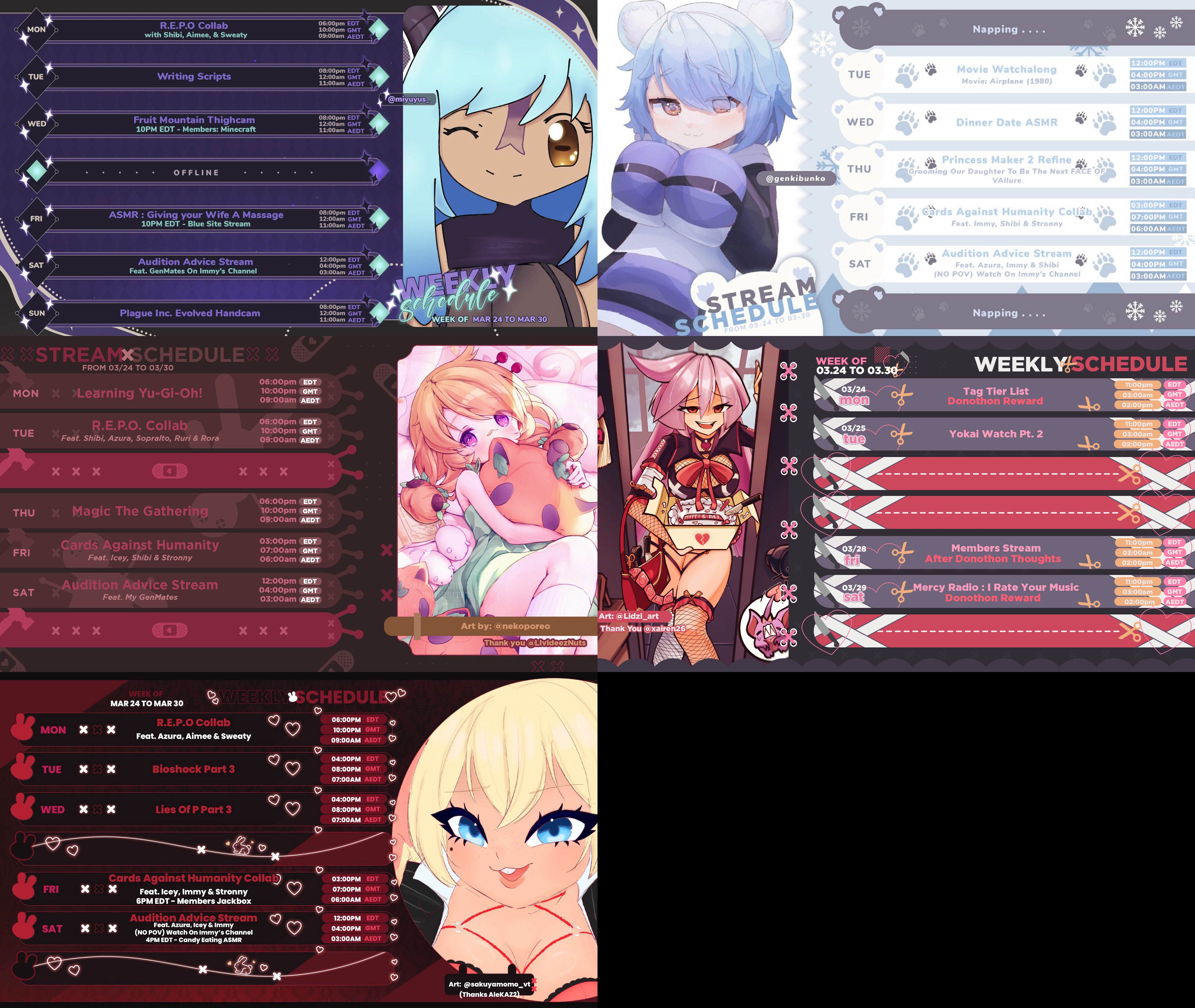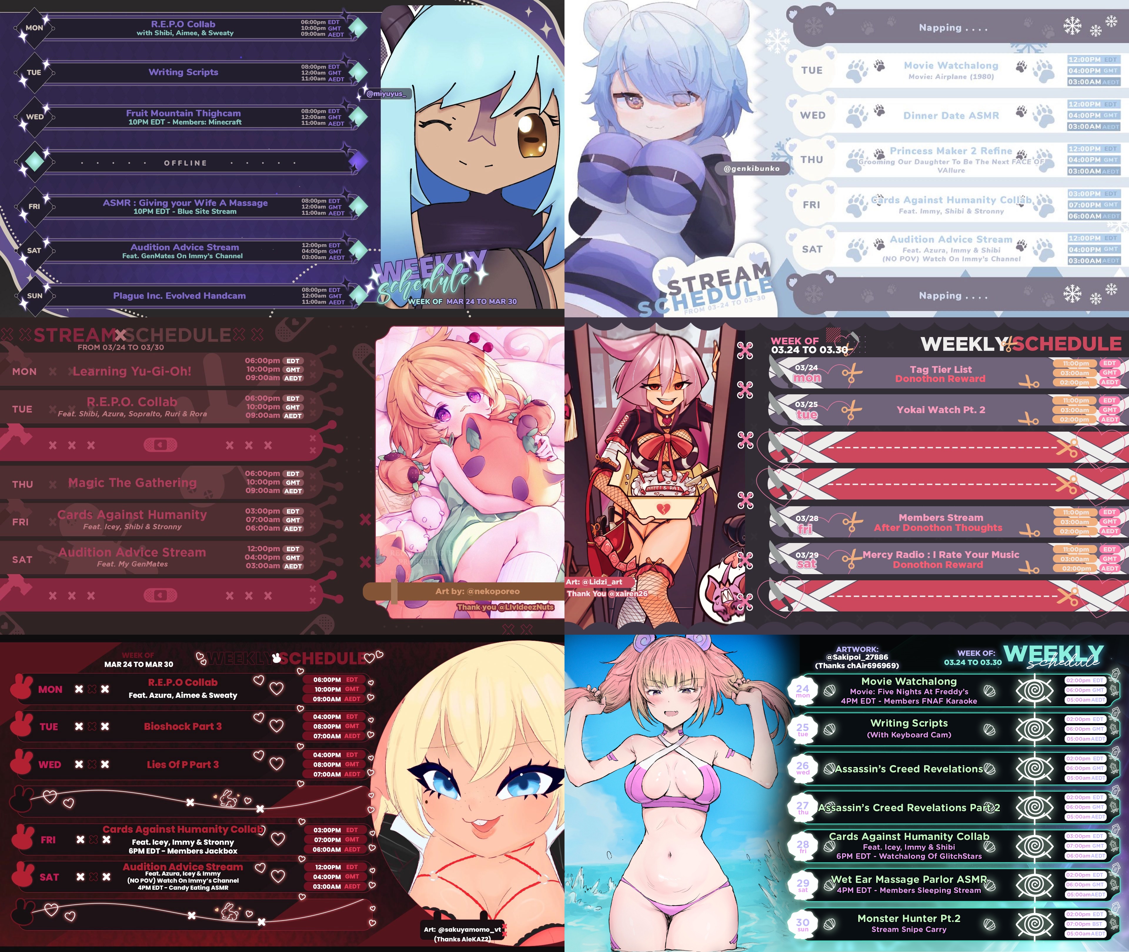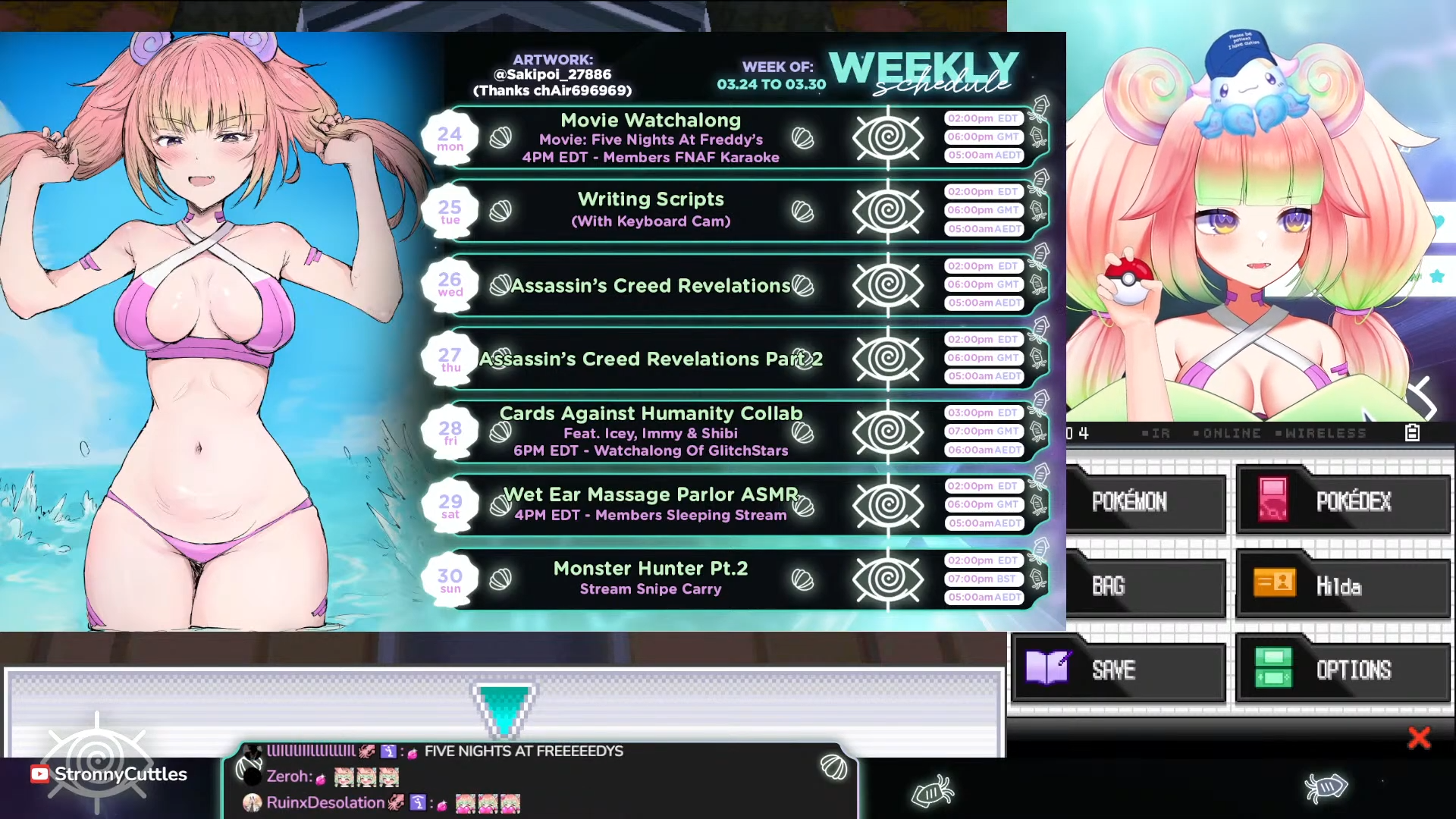 YouTube - Kino SFW streams. Expect some spice and kayfabe but nothing TOS-breaking. Expect 3 streams per week at minimum.