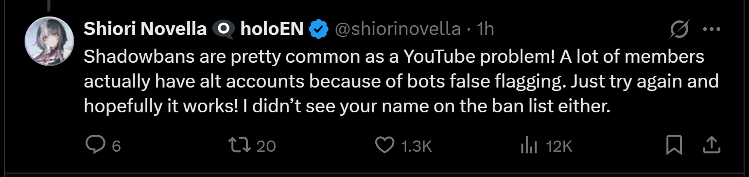 Shiori is a softie with a big heart. She constantly sought approval and reassurance from chat when she messed up, even when it was just unintentionally killing NPCs in games. I can understand her blocking out criticism for her own protection, even if I would have handled things differently.