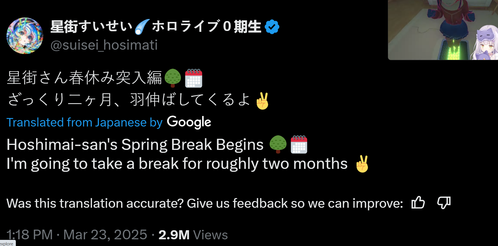 Suisei is going on a 2 month hiatus. Where is she going?