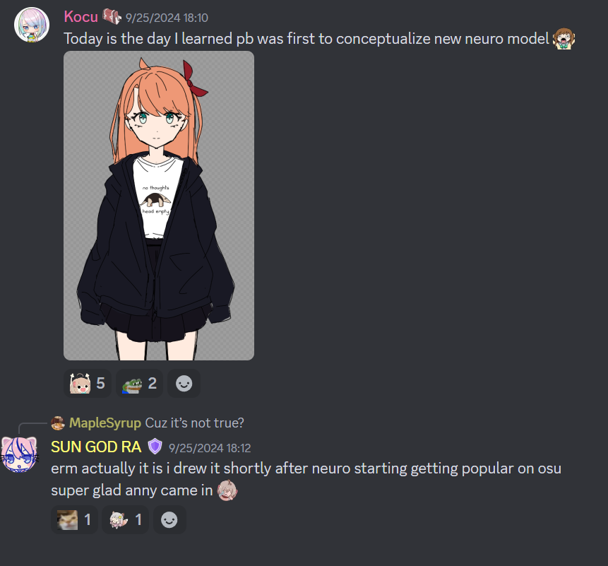 Neuro-sama is a neural network created by Vedal in 2018 for the purpose of learning to play osu! In December 2022 Vedal revived the project with the addition of a large language model, a TTS software and a Live2D model, which allow Neuro-sama to interact with her chat as a VTuber. Since then, she has been entertaining the chat with responses and unhinged rants nearly daily, as well as learning new skills such as singing, playing other games, and collaborating with other VTubers. Join /swarm/ today and welcome our new AI overlord!