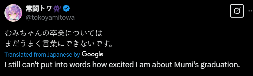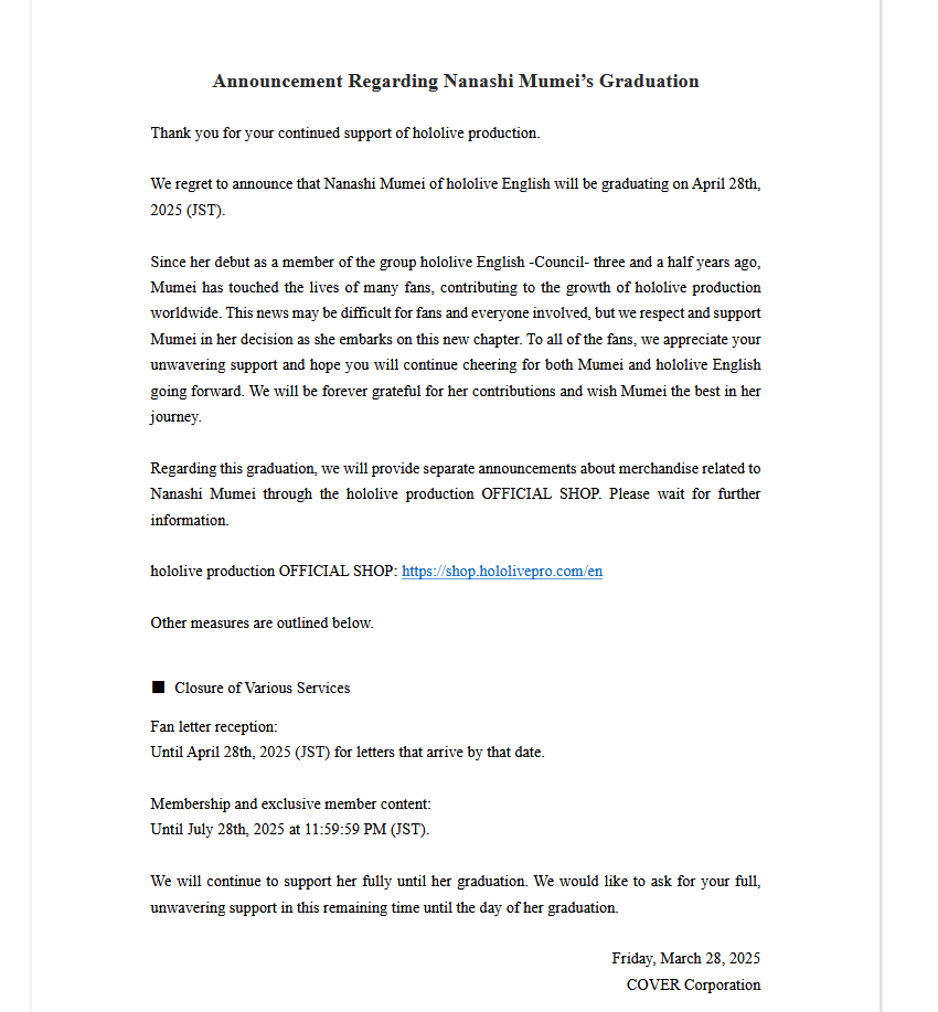 Mumei will graduate April 28th.