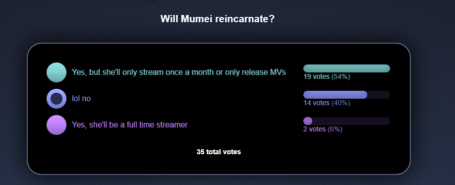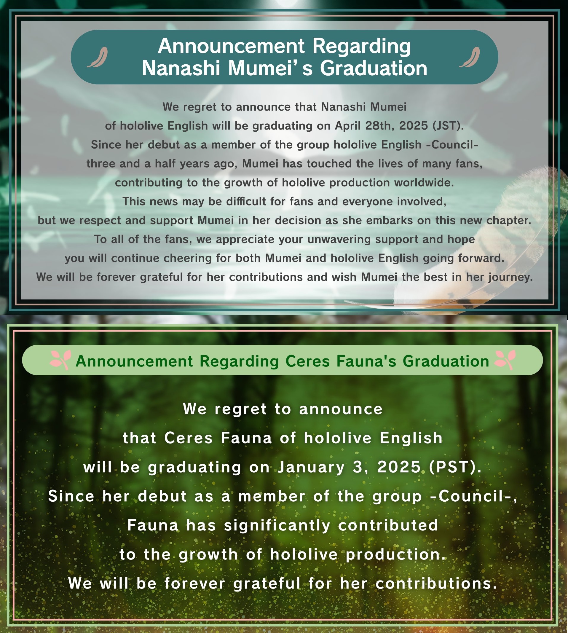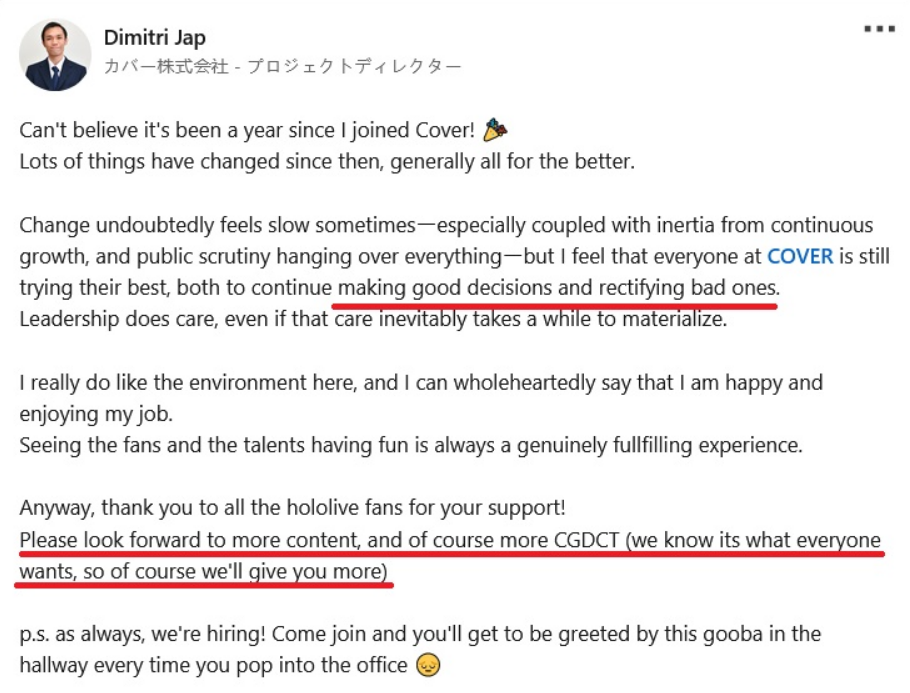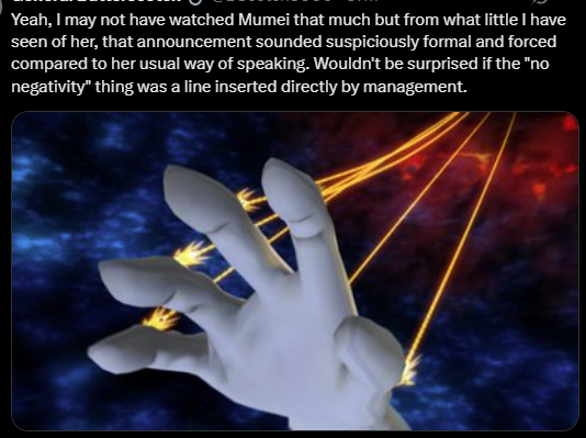 Thank you for everything you've done, you have inspired me so much in my career as a vtuber and shaped it to what it is today. You've pioneered the EN vtubing sphere with your ideas and creativity. I looked into 3D because of your 3D worlds and concerts for Myth and the tournaments and events were inspired and motivated by all your hard work towards the group projects you've done for Hololive. I wouldn't have been as motivated to go beyond my capabilities without you inspiring me in every step. You have such a creative and innovative mind in the field of entertainment and use of technology and I know you will do great things in your next chapter in life. Thank you again, I will always look up to you.