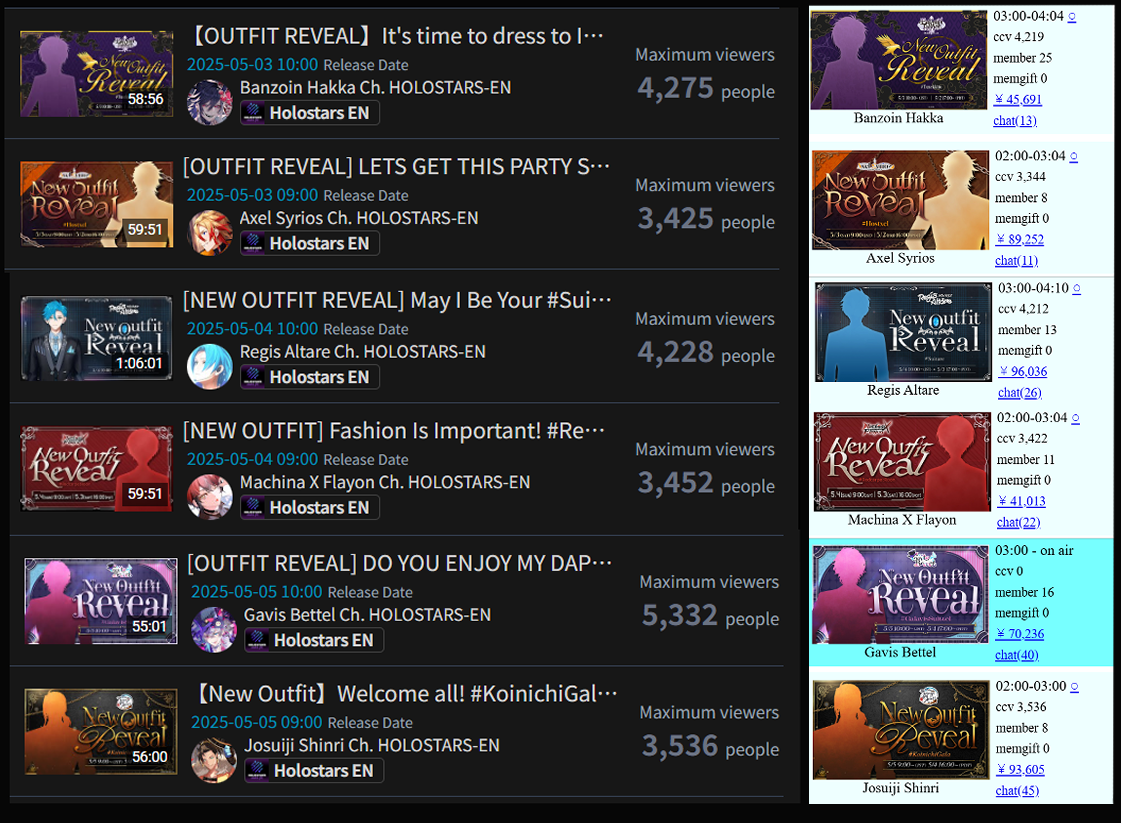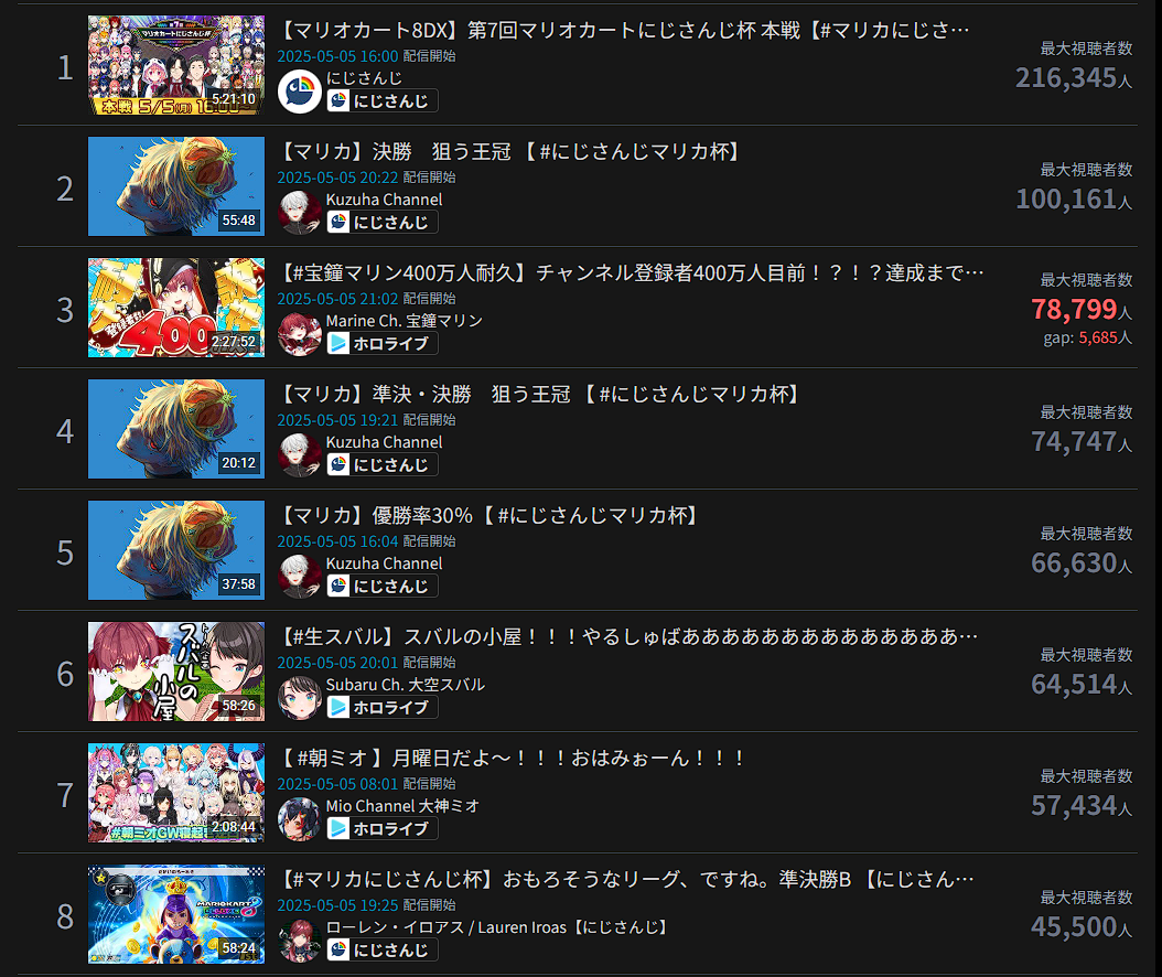 Gold for Niji main channel with their MarioKart tournament with Kuzuha getting silver with the same and Marine, bronze in a day with a comically large tally, the second highest in history with 68 entries trailing only 2022-08-28 which had 70 entries