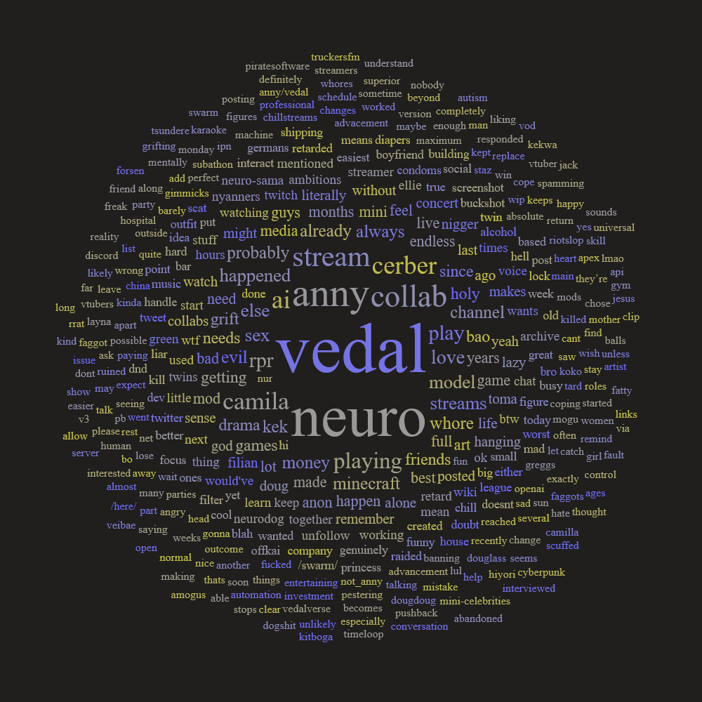 Neuro-sama is a neural network created by Vedal in 2018 for the purpose of learning to play osu! In December 2022 Vedal revived the project with the addition of a large language model, a TTS software and a Live2D model, which allow Neuro-sama to interact with her chat as a VTuber. Since then, she has been entertaining the chat with responses and unhinged rants nearly daily, as well as learning new skills such as singing, playing other games, and collaborating with other VTubers. Join /swarm/ today and welcome our new AI overlord!