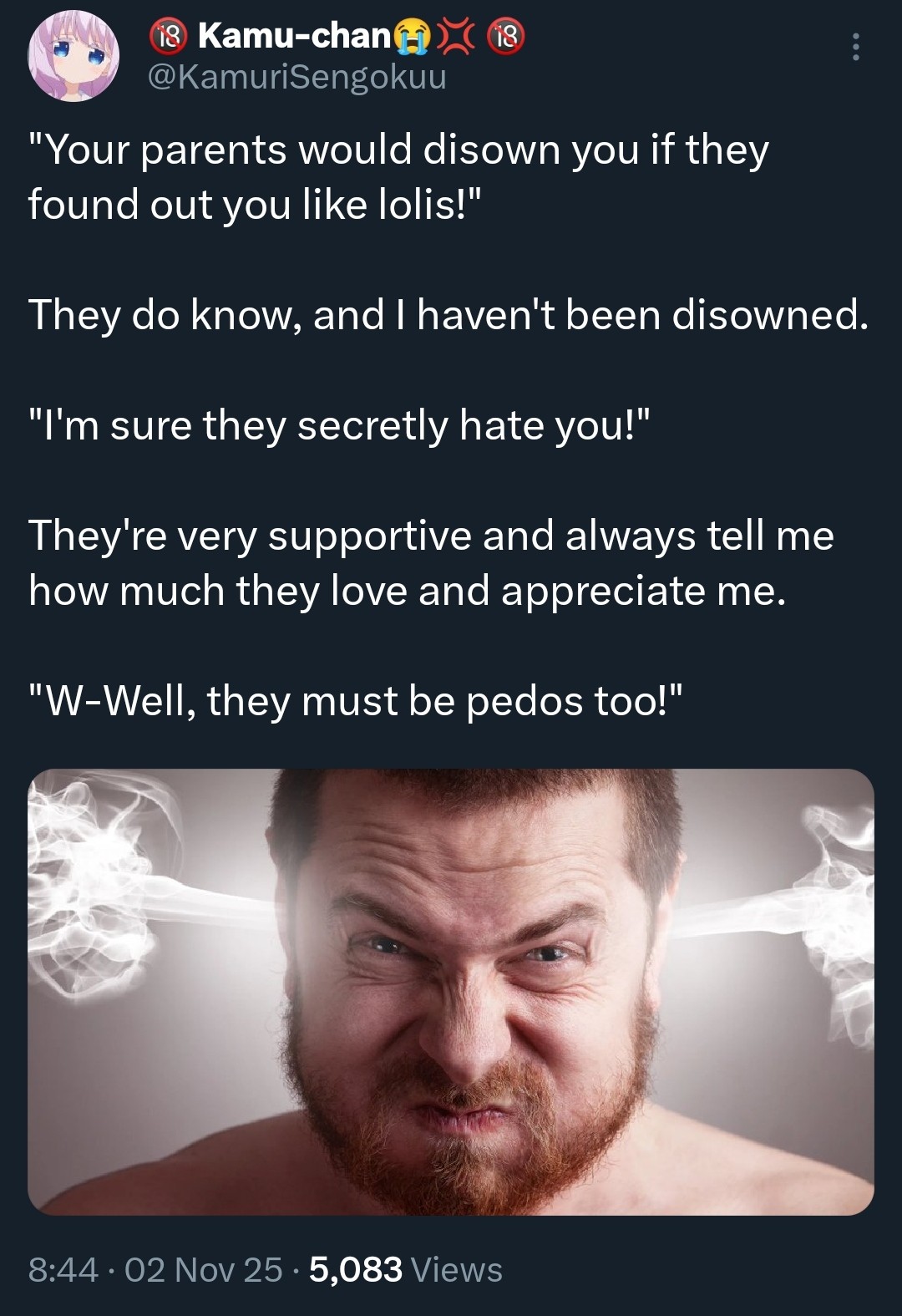 As a side quest, there's one Twitter screenshot of some guy saying "anime fans are pedos" and next to it a screenshot of a news article saying he got found with CP, do you happen to have that pic?